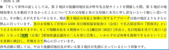 統一教会の内部資料である「TM特別報告」の202年5月の報告には「先日祝福を受けて食口(会員/信者)となった天野正基愛知県議会議員の二人を常に召集し、いかにすれば知事を復帰できるかということを真剣に検討し、作戦を立て熱心に行っています」との記載がある。報告者は元統一教会会長で、金沢市長選に出馬する徳野英治氏だ。